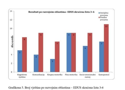 Zabilježen je značajan rast vještina: od inicijalne do finalne procjene, svako dijete je pokazalo napredak u svim razvojnim oblastima.